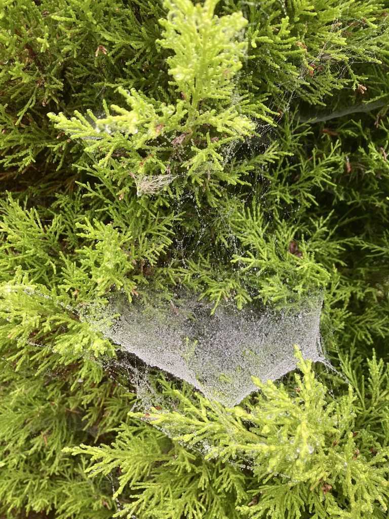 As an amateur photographer, I find the tiny rain droplets on grass blades, leaves, and petals so fascinating. In different light conditions, they look like jewels. Then there are the intricate spider web patterns revealed by the droplets, glistening like a finely crafted diamond necklace or lace. We often overlook these web designs, only for them to be revealed as complex works of art revealed by the rain. Below is a photograph of an exquisite example of this.