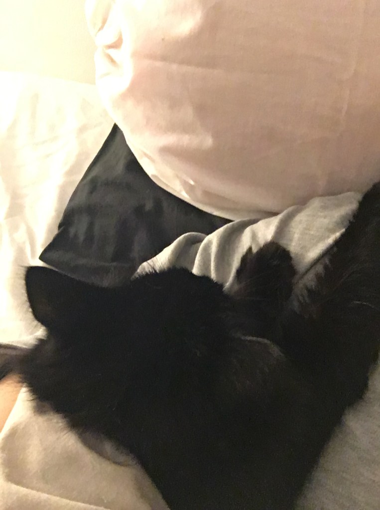 As I have mentioned in my other posts, I am sensitive to touch. I prefer strong pressure to light touches and the cats in my life really delivers. When Anakin and Chewie were alive, I didn’t need a weighted blanket to nap. They were my weighted blankets. Chewie especially loved sleeping in my arms as in the photo below.
